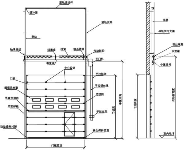 门板连接铰链为热镀锌冷轧钢板冲压制作,材料厚度δ=2.5mm,镀锌厚度大于280?m。导轨为δ=2.0mm热镀锌钢板辊压制作的2英寸工业门专用导轨,以确保导轮在导轨内平稳运行;轨道护板为δ=2mm热镀锌钢板辊压制作,护板上设有门侧密封橡胶的插槽及导轨连接的安装孔;导轮采用工业门专用导轮,内含滚轮轴承、运行平稳、无噪音。