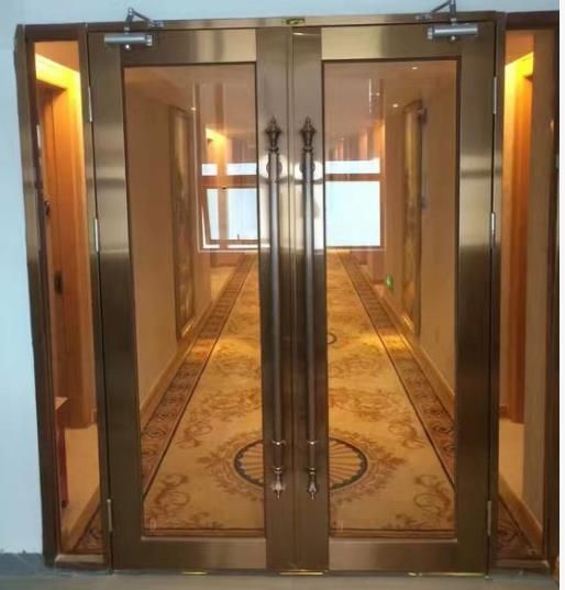 2、双开防火玻璃门选用1.2mm厚不锈钢型材轧制成型,在型材槽角处装置防火胶条;双开防火玻璃门门扇运用后0.8mm的资料,经过长期研讨及技术改进,在前后装饰面板结合位置,采用科学的咬缝工艺,可使防火玻璃门结构更为巩固,外型漂亮。